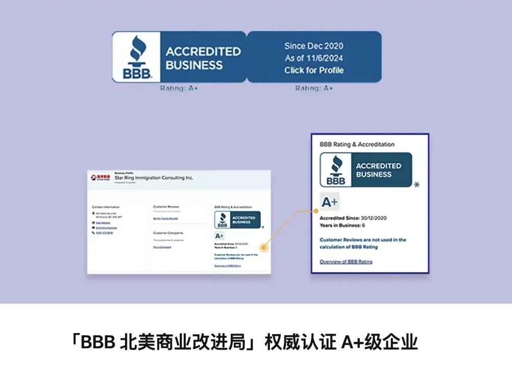 凭借诚信与专业,星环移民多次荣获当地政府及商会的 “杰出企业” 称号,并获 BBB 北美商业改进局 A+级认证,在谷歌平台上一直保持着“五星好评”
