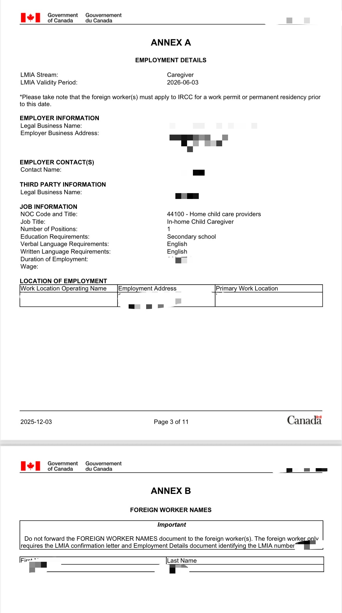 LMIA申请正式提交至Service Canada,职位为In-home Child Caregiver。
