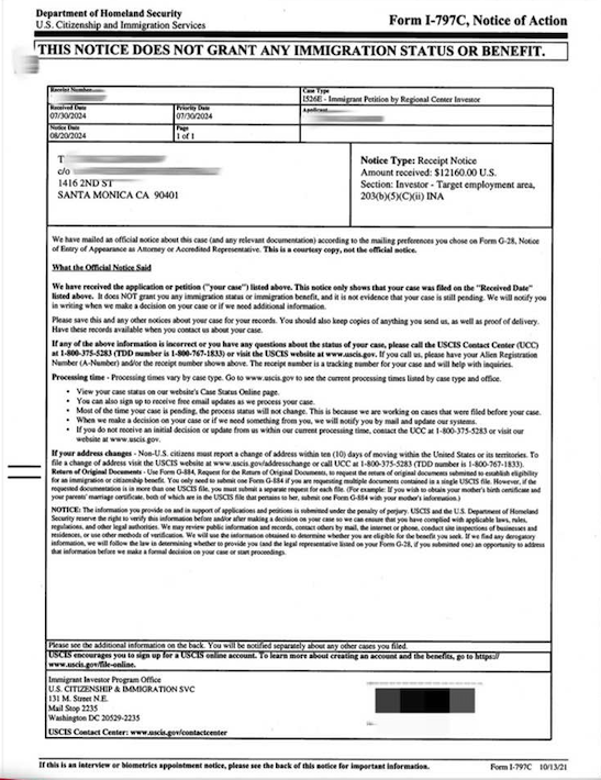 | 2024年8月23日 | 收到I-526E受理回执(Form I-797C) |