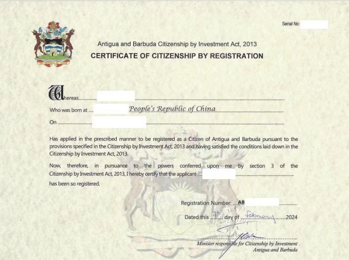 | 2024年2月16日 | 正式取得安提瓜和巴布达公民身份,护照及公民纸签发完成 |