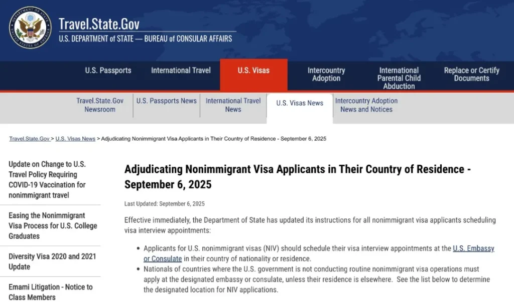 美国签证政策再次迎来重大调整。2025年9月6日,美国国务院官网发布最新通知,宣布全面叫停“第三国面签”。