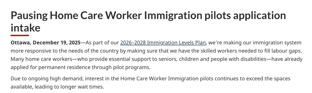 2025年3月31日,加东时间上午10点(西部时间上午7点),“联邦护工移民试点新政”正式开放。仅仅历时3个半小时,两个类别共计5,500个“加拿大境内工人”渠道的移民配额就已被抢光!